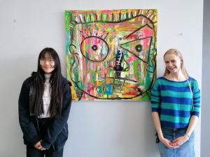 Jenny (links) und Janine (rechts) vor dem Kunstwerk „lonely“ von Maximilian Dußmann